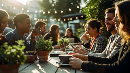 Group of young multiethnic people having a coffee break outdoors.
