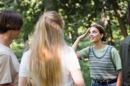 Smiling teenage girl standing near blurred interracial friends outdoors