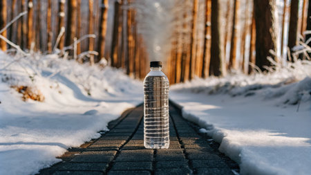 Plastic water bottle on a frosty pathway in the middle of a snowy forest.