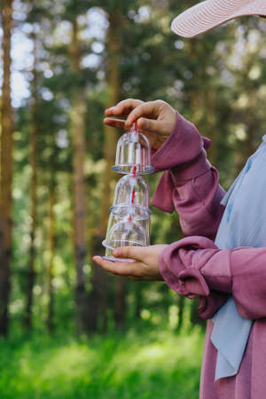 The girl is holding a jar for hijama. Hijama, bloodletting, treatment of sunna. Jars for bloodletting against the background of trees and greenery.
