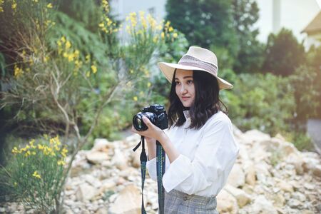 Cropped shot woman having fun in garden with camera travel photo of photographer.