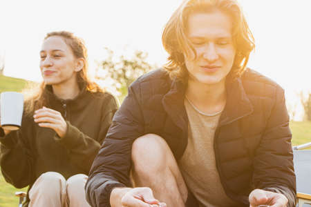 Young couple drinking coffee and playing guitar while camping on their morning vacation.