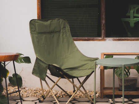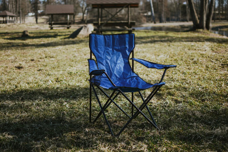 empty camping chair for Outdoor Camping in forest. Tourism, outdoors recreation, active style of life
