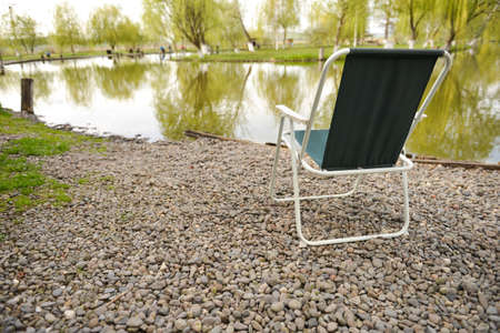 Blue camping chair against the backdrop of a river on an evening spring day. High quality photo