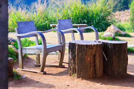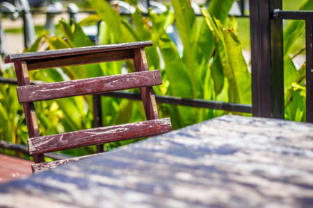 Blur image Old wooden chair in the garden on green leaves background, Vintage tone.