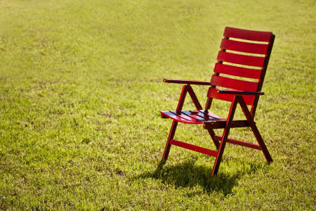 empty striped lawn chair in garden on grass against background of sunlight. Relax and chill.