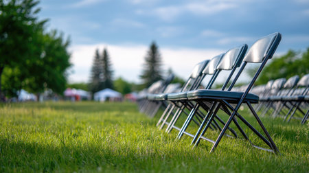 A large number of vacant folding chairs set up outdoors on grass, awaiting a public event or gathering