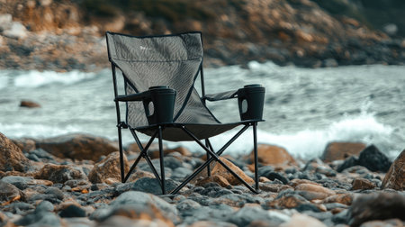 This image captures a portable camping chair set against a serene rocky shore, inviting moments of relaxation beside gentle sea waves, ideal for nature lovers.