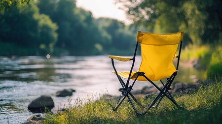 A beautifully designed and stylish portable camping chair set up by a serene riverside, perfect for outdoor enthusiasts to relax and fully enjoy the tranquility of nature