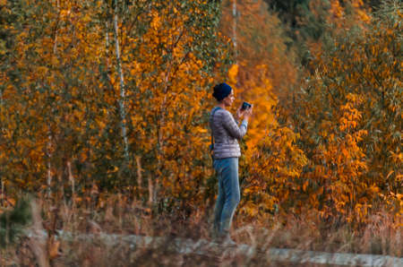 Girl traveler with camera takes beautiful photos of nature. Young independent female tourist photographer, photographs a beautiful autumn landscape with professional digital camera. travel concept