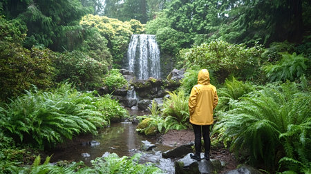 Tourist wearing a yellow raincoat stands on rocks, admiring a beautiful waterfall cascading down mossy rocks in a lush green forest filled with ferns and other plants