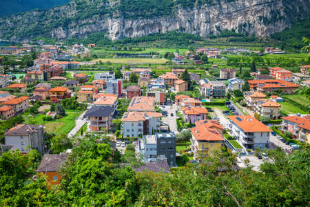 Aerial view and Landscape of Arco town at rock at Sarca Valley near Garda lake of Trentino in Italy. Scenery with cityscape and mountain at Arco old city in Trento near Riva del Garda. Outdoor