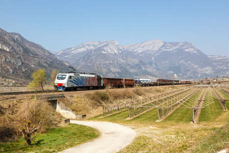 Avio, Italy - March 25, 2022: Freight cargo train of Lokomotion on Brenner Railway near Avio, Italy.