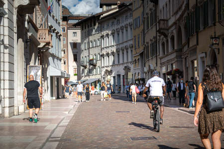 View of one of the main pedestrian streets in the historic center of Trento, Italy. Historic buildings and people strolling around