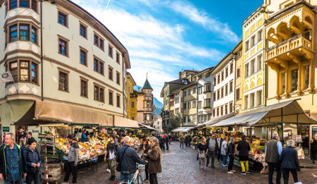 Bolzano, italy - October 19: People shopping at a famous Market Square in the old town at october 19,2018 in Bolzano in italy