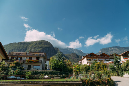 Italy. Trentino 07/09/2022 Riva del Garda. Houses and architecture of the city against the backdrop of mountains. Beauty and vacation, summer day, travel. Card
