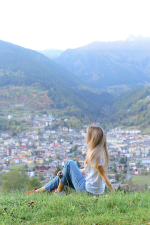 Young woman sitting in mountains, little village in background.
