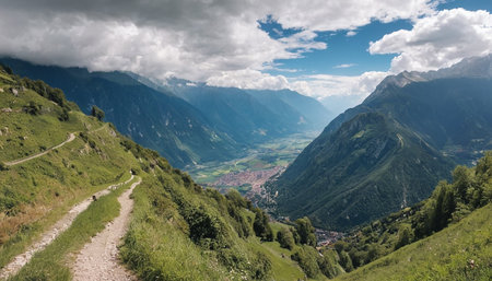 Panoramic view of the valley and mountains of the Swiss Alps