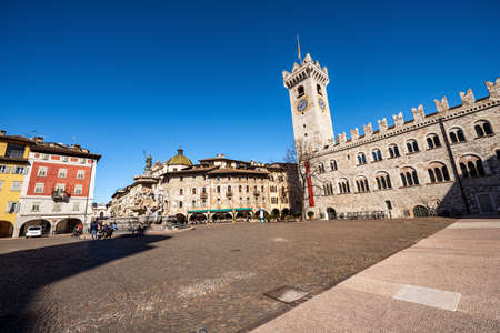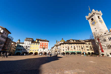 TRENTO, TRENTINO ALTO ADIGE, ITALY - MARCH 8th, 2020: Piazza del Duomo, Cathedral square in Trento city with the Neptune fountain, Civic tower, Praetorian Palace and the frescoed houses Cazuffi Rella.