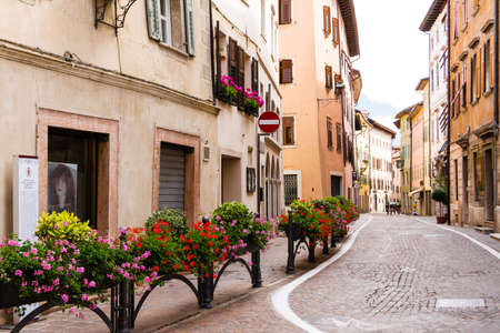 Trento, Italy - March 21, 2017: People in a shopping street in the old town with houses with diverse facades, cafes and shops.
