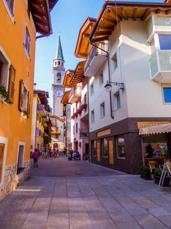 PINZOLO, ITALY - AUGUST 28, 2018: View of the downtown with the bell tower of the Church of San Lorenzo (St. Lawrence) in the background.