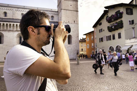 Close-up of a tourist taking a photo, Piazza Duomo, Trento, Italy. In the background the Duomo and people strolling. Trento is an educational, scientific, financial and political center in Italy
