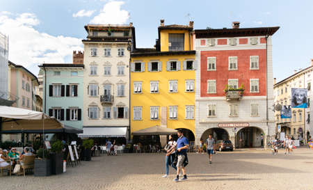 View of the colorful historic buildings surrounding Piazza Duomo, Trento, Italy, with people strolling. Trento is an educational, scientific, financial and political center in Northern Italy.