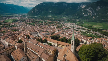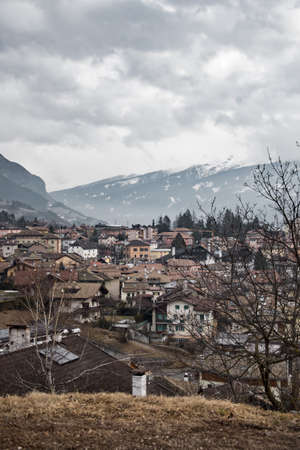 Alps mountains and Architecture of Mezzocorona, Italy. A comune in Trentino in the northern Italian region Trentino-Alto Adige, Sudtirol