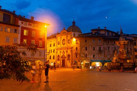 TRENTO, ITALY - SEPTEMBER 1, 2019: Evening view of square Piazza Duomo in Trento city with Fountain of Neptune, Italy, Europe