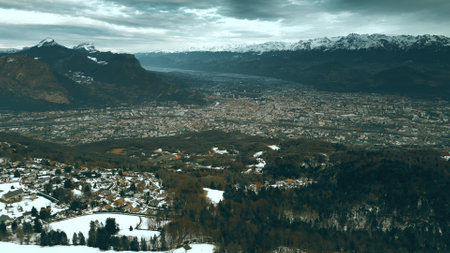 Aerial shot of Grenoble and surrounding Alps in winter, France. View to the east from the Vercors mountain range