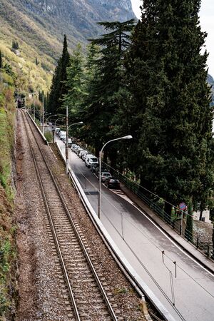 Railroad rails on Lake Como in Italy, near the city of Varena