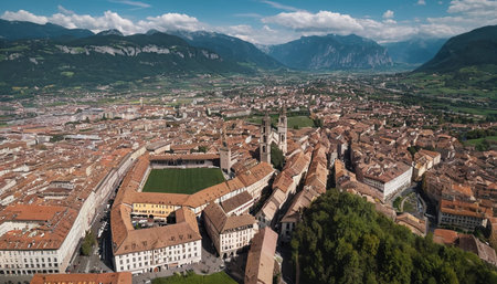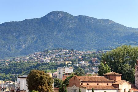 Aerial panoramic view of residential quarter of Brescia city and Alps mountain range, green trees foreground, blue cloudy sky, Lombardy, Northern Italy