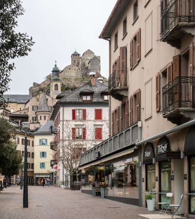 Sion, Switzerland - March 13th 2021: Urban street in the historic city centre.