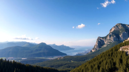 Idyllic Alps landscape with green forest on rocky mountain under beautiful sky