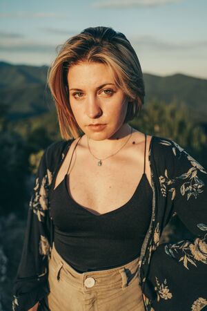 A young woman with blonde hair and freckles looks off into the distance with a mountain range in the background.