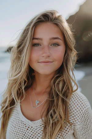 A young woman with blonde hair and blue eyes stands on a beach, looking towards the camera. The background is blurred, showing the ocean and a hint of buildings.
