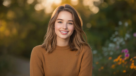 A young woman with a warm smile enjoying a serene moment in nature. The soft colors and floral background enhance the feeling of tranquility and joy.