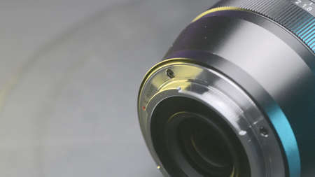 Close-up of new camera lens. Action. Back of professional camera lens. New model of camera lens. Professional shooting with new camera lens