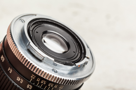 Vintage manual focus lens in blur. Standard lens. Vintage analog photographic equipment with shallow depth of field.