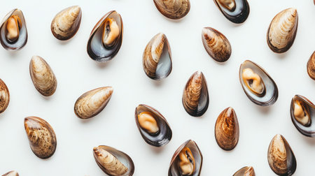 Mussel opens to reveal soft flesh and iridescent interior. Minimalist white background emphasizes delicate details. Concept of seafood, culinary arts, ocean cuisine.
