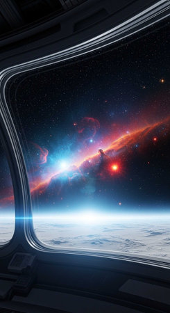 A stunning view of the galaxy through a spacecraft window with vibrant stars and planets