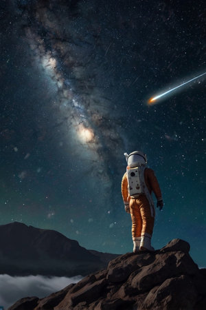 A lone astronaut in a futuristic space suit gazes into the vast cosmos, symbolizing exploration and the mysteries of the universe. This artwork captures the essence of adventure and discovery in outer space.
