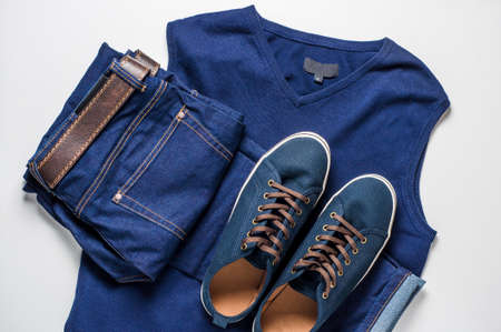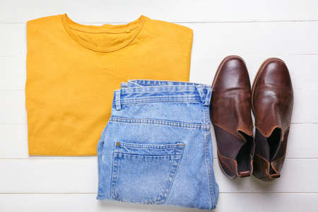 Fashionable men's clothing. Jeans and shoes on light background