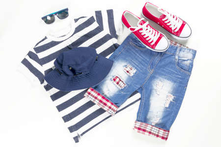 Collage of children clothing in marine style. Summer, spring boy outfit. Fashion trendy look