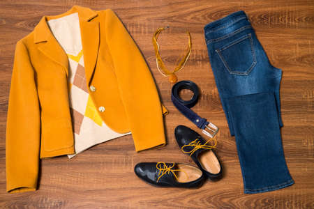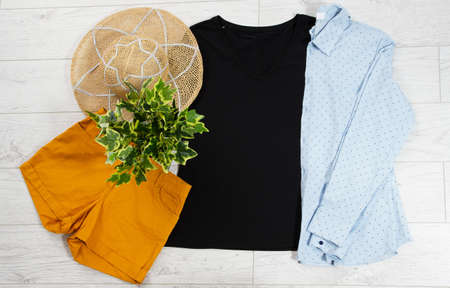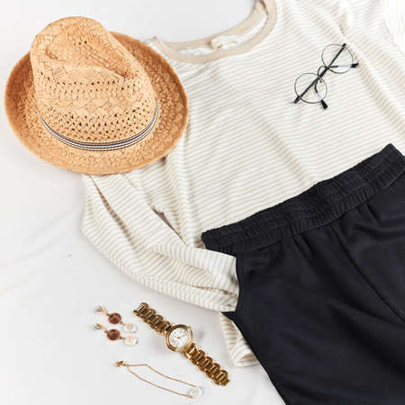 clothes and accessories for walking . country life, urban style. top view cropped photo.