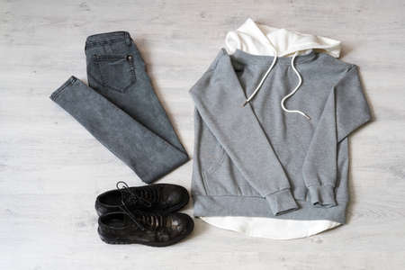 Teen clothing set: grey sweatshirt, black jeans and boots in military style