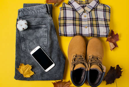 layout of autumn clothes of dark jeans, boots, a shirt and a phone on a yellow background. In warm autumn colors. fallen leaves are scattered nearby. flat lay.