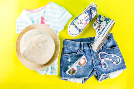 Summer vacation concept, summer child's cloth set - kids shorts, T-shirt, hat, sun glasses, bracelet necklace, sneakers, bright yellow background above flat lay copy space