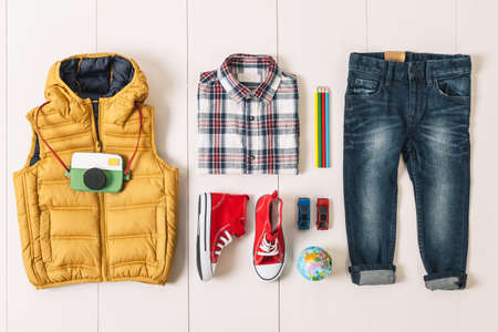 Top view fashion trendy look of kids clothes on white wooden background. Kids fashion. Spring, autumn outfit.