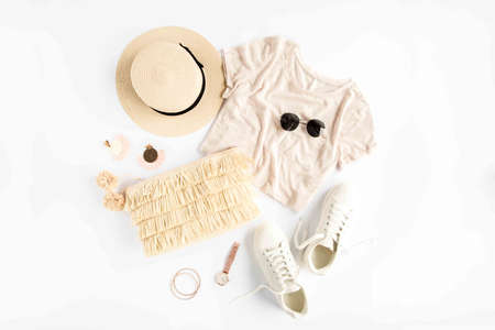 Woman summer clothes travel, collage on white background. Straw hat, bag, sunglasses and sneakers. Top view, flat lay